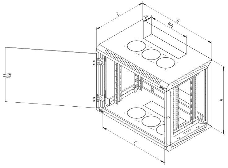 Horná, spodná a zadná časť skrine sú vybavené káblovými vstupmi zakrytými odlamovacími zátkami. Súčasťou balenia je plastový rám a tesniaca krytka kefy na utesnenie vstupného otvoru proti prachu.