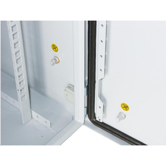 Vonkajší nástenný rozvádzač vyrobený z válcované ocele o hrúbke 1,5 mm. Trojvrstvová povrchová úprava. Ukončenie: dvere - plné, otvárateľné o 110°, 3-bodový zámok, zameniteľný smer otvárania, tesnenie z penového polyuretánu zádny kryt - plný bočný kryt - plný horný kryt - plný