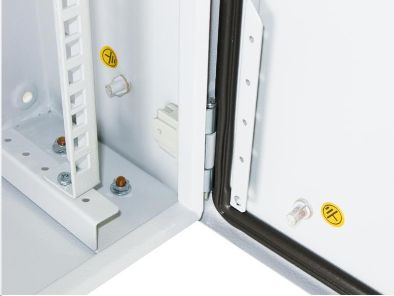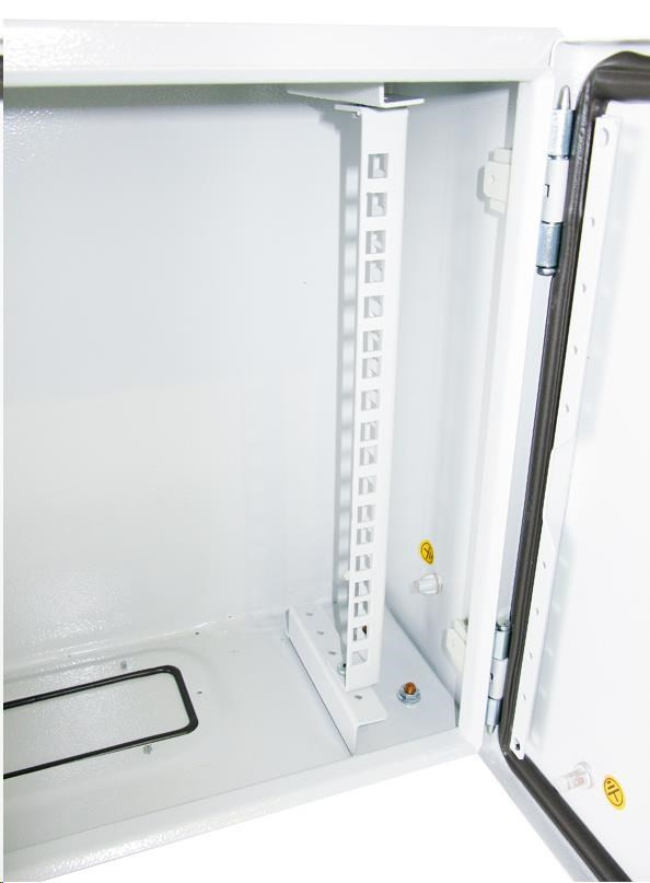 Vonkajší nástenný rozvádzač vyrobený z valcovanej ocele s hrúbkou 1,5 mm. Trojvrstvá povrchová úprava. Provedenie: dvere - plné, otvárateľné o 110°, zameniteľný smer otvárania, tesnenie z penového polyuretánu zadný kryt - plný bočný kryt - plný horný kryt - plný