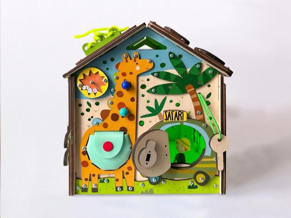 Domček activity board - Safari je tvorené zo šiestej dosky s hracími a montessori prvkami zameranými na zručnosť, logiku, kreativitu a trpezlivosť. Domček vtiahne deti do sveta objavovania a fantázie, kde si deti samé hrajú a učia sa tým najprirodzenejším spôsobom, pomocou hry.