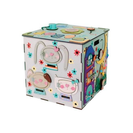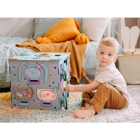 Originálna activity board kocka s LED osvetlením XXL je montessori hračka, ktorá deťom prinesie veľa zábavy, zdokonalí ich schopnosti a naučí ich novým zručnostiam. Každá zo strán modrej activity board je originálna a ponúka nespočet možností na hru, poznávanie a skúmanie. Nechýbajú ozubené kolieska, rôzne spôsoby zapínania a zatvárania, šnúrka, bludisko, korálky, vkladacie puzzle, rôzne prekvapenia i slnečný vypínač, ktorý activity board kocku rozžiari.