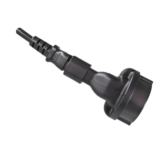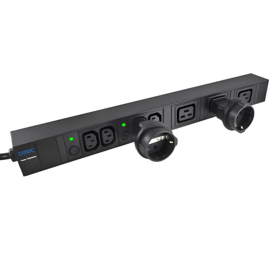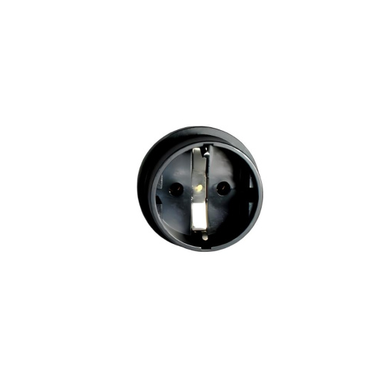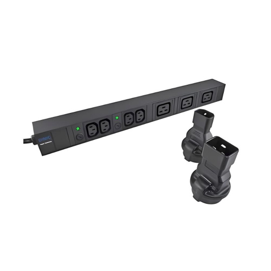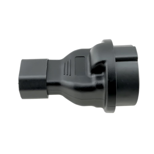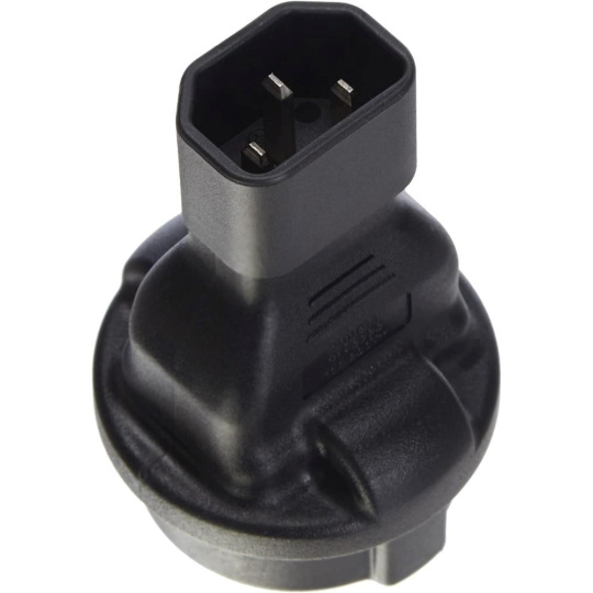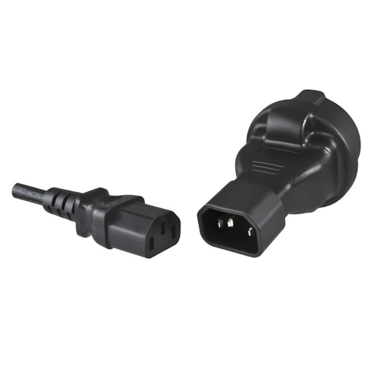 Napájací adaptér v čiernom prevedení pre UPC, s vstupným konektorom IEC C14 (max. 10 A) a výstupnou zásuvkou SCHUKO CEE 7/3 (max. 16 A). Výstupná zásuvka je rovná, nemeckého typu, s ochrannými náramkami po stranách, vhodná na pripojenie vidlíc vybavených zemniacimi náramkami. Je veľmi dôležité zabezpečiť, aby prúd odobraný zo zásuvky nikdy neprekročil 10 A, aby nedošlo k preťaženiu vstupného konektora C14.