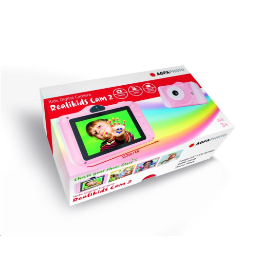 Realikids Cam 2 je ideálny digitálny fotoaparát pre deti. Jeho CMOS senzor umožňuje zachytávať nádherné fotografie a videá v HD. Má 3,5" LCD displej, na ktorom si môžete prezrieť svoje fotografie. Má tiež port pre micro SD karty až do 32 GB (nie je súčasťou dodávky). Jeho zábavný a ergonomický dizajn zaručuje dokonalé uchopenie a poteší každého malého fotografa.