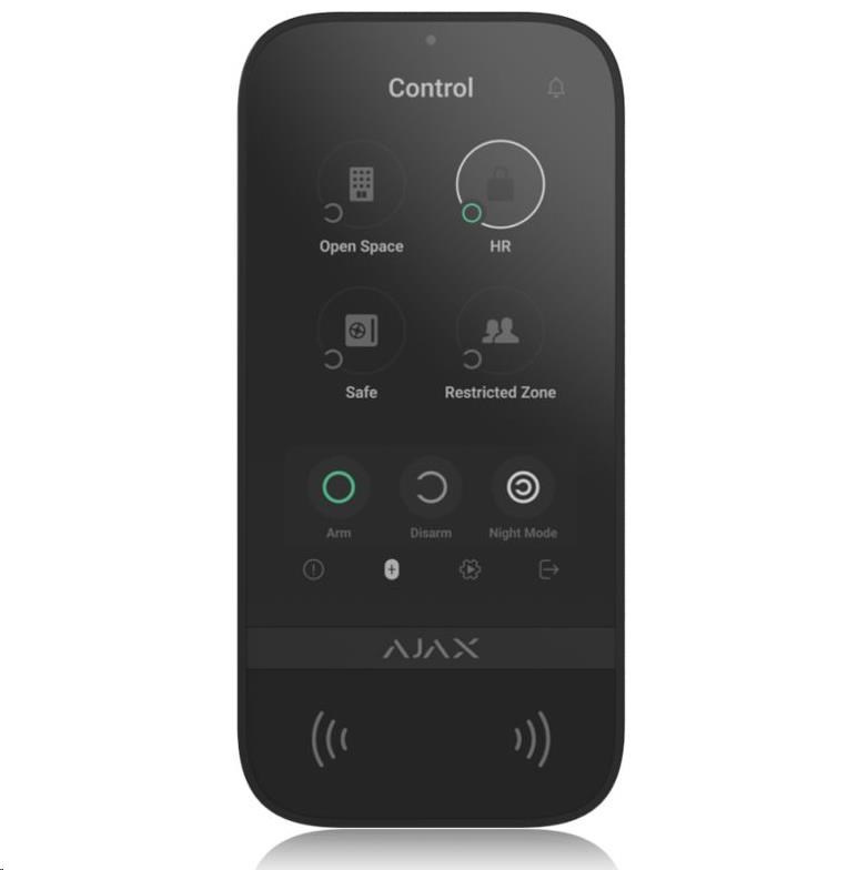 Klávesnica KeyPad TouchScreen zdedila rozhranie aplikácií Ajax pre chytré telefóny a poskytuje tak jednoduché a známe ovládanie systému. Päťpalcová dotyková obrazovka umožňuje rýchly prístup k aktuálnemu režimu zabezpečenia ľubovoľnej skupiny. Aktivuje sa zdvihnutím ruky v blízkosti a má automatickú reguláciu jasu. Klávesnica má zvukovú indikáciu a môže upozorňovať na alarmy, oneskorenie pri vstupe/výstupe a otvorenie dverí pri odomknutí systému. Hlasitosť sa nastavuje v aplikáciách Ajax. Klávesnica tiež zobrazuje výsledok kontroly integrity systému a informuje o poruchách pri zastrešení.