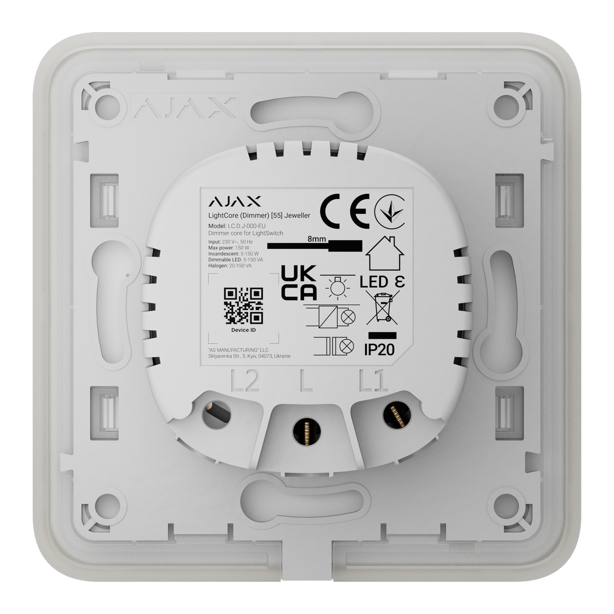 Ajax LightSwitch Dimmer Jeweller je chytrý dotykový nástenný stmívač pre osvetlenie určený na vnútornú inštaláciu.
