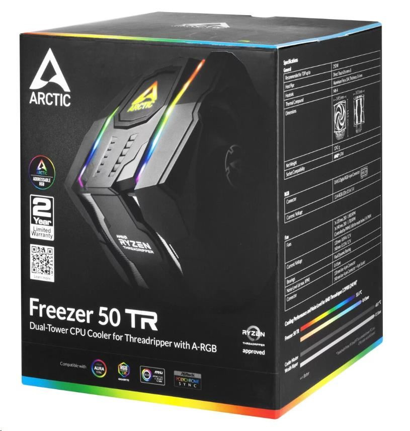 ARCTIC Freezer 50 TR je dvojvežový chladič CPU s dvoma ventilátormi série P v konfigurácii push-pull. Ide o mimoriadne výkonné chladiace riešenie pre procesory AMD Ryzen Threadripper, ktoré dokáže efektívne a ticho chladiť procesory s 32 jadrami a viac. Freezer 50 TR je tiež prvým chladičom CPU od spoločnosti ARCTIC vybaveným plne adresovateľným RGB, ktorý vám poskytuje úplne prispôsobiteľné osvetlenie a individuálny farebný vzhľad počítača.