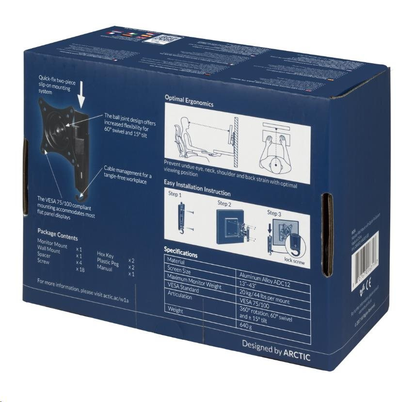 ARCTIC W1A je jednootáčkový držiak s 3-osovým kĺbom, ktorý ponúka plynulé nastavenie uhla obrazovky s 360° rotáciou, 60° otočením a ±15° náklonom. Konštrukcia s guľovým kĺbom poskytuje flexibilitu na dokonalé umiestnenie monitora, aby sa znížilo namáhanie očí, krku, ramien a chrbta. Pripevňuje sa tesne k stene a maximalizuje pracovnú plochu. Dvojdielny systém priamej montáže, ktorý je kompatibilný s monitormi s uhlopriečkou od 13" do 43", umožňuje rýchlu inštaláciu a podporuje hmotnosť až do 20 kg.