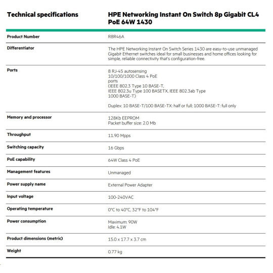 | Aruba Instant On 1430 8G Class4 PoE 64W Switch (R8R46A) | |