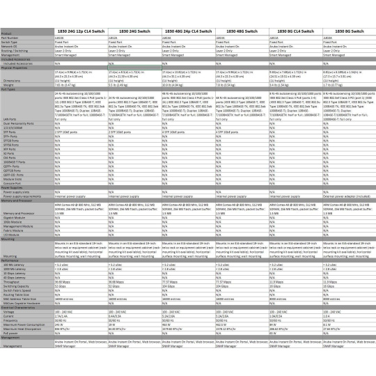 | Aruba Instant On 1830 8G Switch (JL810A) | Aruba Instant On 1830 8G 4p Class4 PoE 65W Switch (JL811A) | Aruba Instant On 1830 24G 2SFP Switch (JL812A) | Aruba Instant On 1830 24G 12p Class4 PoE 2SFP 195W Switch (JL813A) | Aruba Instant On 1830 48G 4SFP Switch (JL814A) | Aruba Instant On 1830 48G 24p Class4 PoE 4SFP 370W Switch (JL815A) | ||||||||