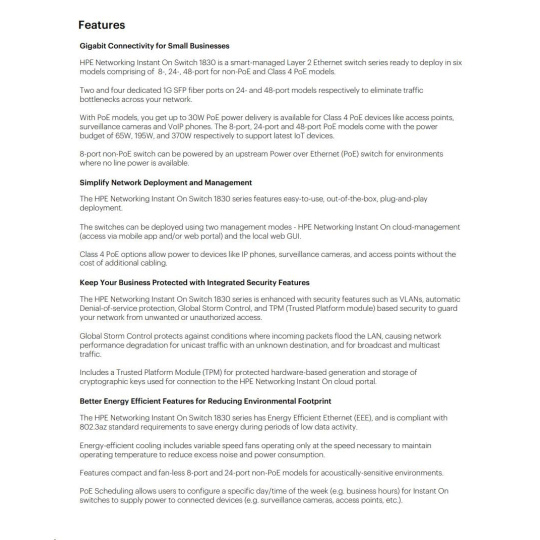 | Aruba Instant On 1830 8G Switch (JL810A) | Aruba Instant On 1830 8G 4p Class4 PoE 65W Switch (JL811A) | Aruba Instant On 1830 24G 2SFP Switch (JL812A) | Aruba Instant On 1830 24G 12p Class4 PoE 2SFP 195W Switch (JL813A) | Aruba Instant On 1830 48G 4SFP Switch (JL814A) | Aruba Instant On 1830 48G 24p Class4 PoE 4SFP 370W Switch (JL815A) | ||||||||