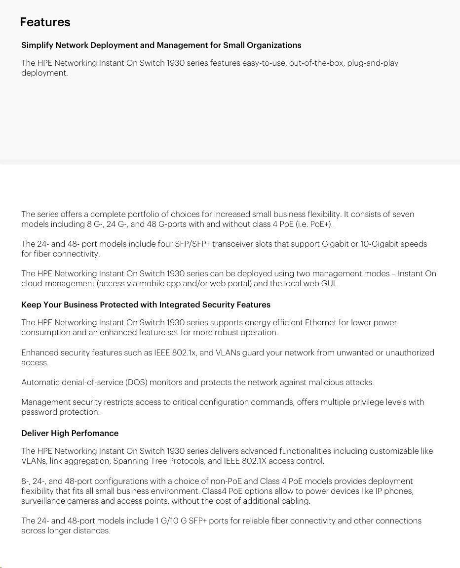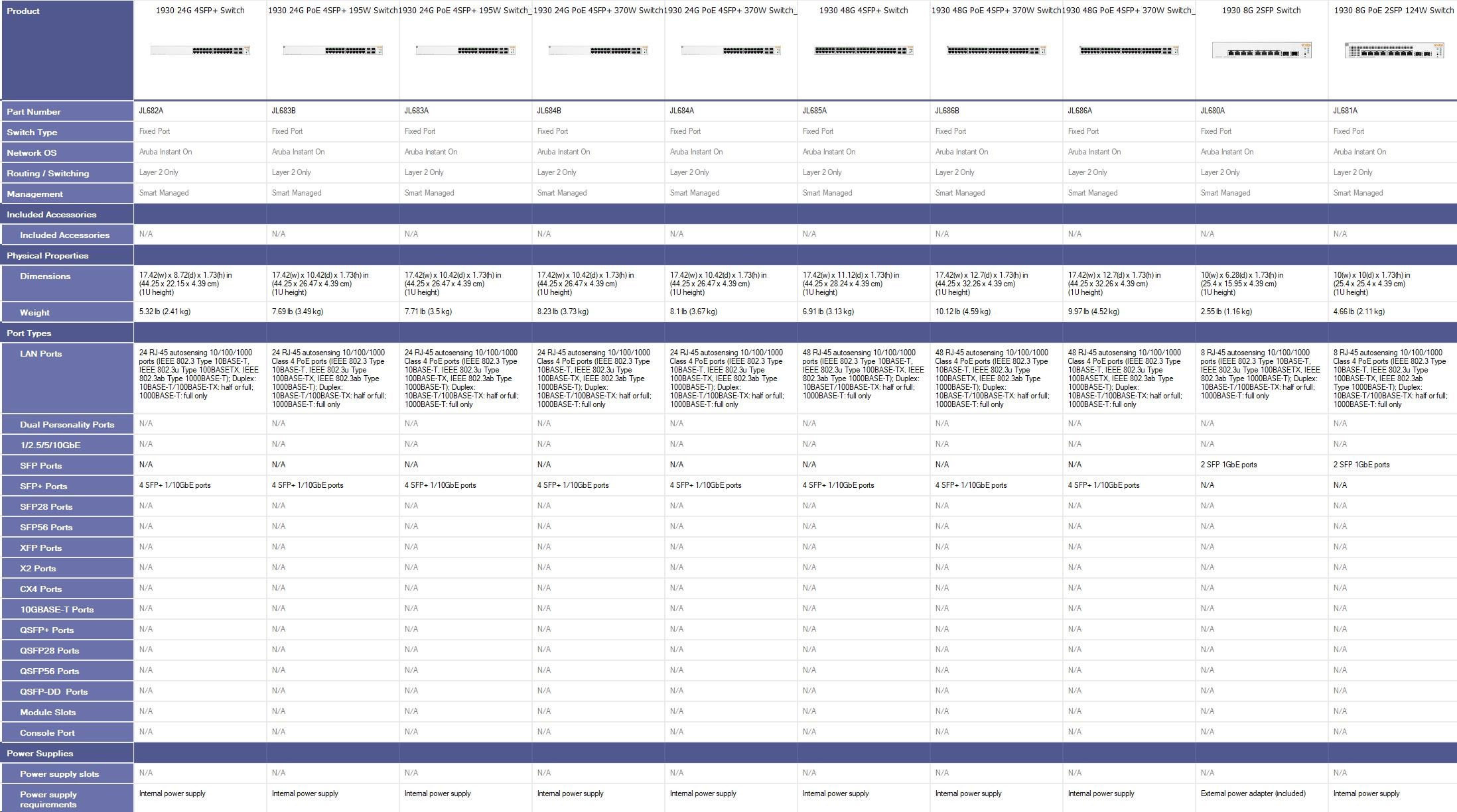 | Transceivers | Aruba Instant On 1G SFP LC SX 500m OM2 MMF Transceiver (R9D16A ) Aruba 1G SFP LC LX 10km SMF Transceiver (J4859D) Aruba Instant On 1G SFP RJ45 T 100m Cat5e Transceiver (R9D17A) Aruba Instant On 10G SFP+ LC SR 300m OM3 MMF Transceiver (R9D18A) Aruba 10G SFP+ LC LR 10km SMF Transceiver (J9151E) | |