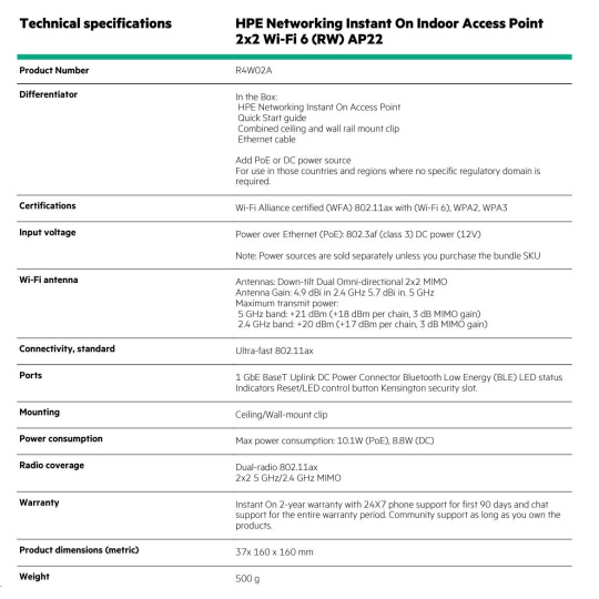 HPE Networking Instant On Indoor Access Point 2x2 Wi-Fi 6 (RW) AP22