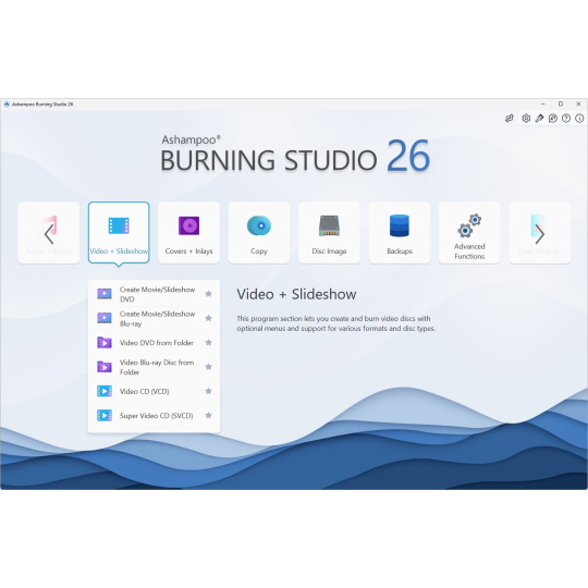 Nové Ashampoo Burning Studio 26 predstavuje najpohodlnejší spôsob bezpečného vypalovania dát a kopírovania diskov CD, DVD a Blu-ray bez námahy. Ripujte audio disky a zálohujte svoju hudbu alebo vytvárajte vlastné hudobné kompilácie s vhodnými obalmi! Ďalšie špičkové multimediálne funkcie vám tiež umožnia vytvárať vlastné filmy a prezentácie, a dokonca ich vypáliť na disk spolu so šikovnými animovanými ponukami. Rozlúčte sa so stratou dát, okamžite zálohujte svoje súbory a vypáľte dôležité dáta na akýkoľvek typ disku pomocou výkonného kompresie a ochrany heslom. A nové komfortné funkcie pre audioknihy, audioprojekcie a podcasty sú zárukou kvalitnej zábavy!