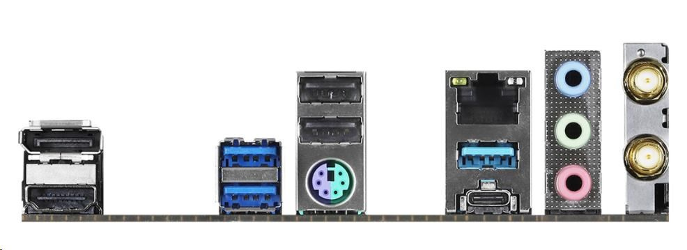 | Vstupy/výstupy na zadnom paneli | - 2 x porty antény - 1 x port myši/klávesnice PS/2 - 1 x port HDMI - 1 x port DisplayPort 1.4 - 2 x USB 2.0 Porty (podporuje ochranu proti ESD) - 3 x USB 3.2 porty typu A Gen1 (podporuje ochranu proti prepätiu) - 1 x USB 3.2 porty typu C Gen1 (podporuje ochranu proti ESD) - 1 x port RJ-45 LAN s LED diódou (ACT/LINK LED a SPEED LED) - HD audio konektory: Line in / predný reproduktor / mikrofón |