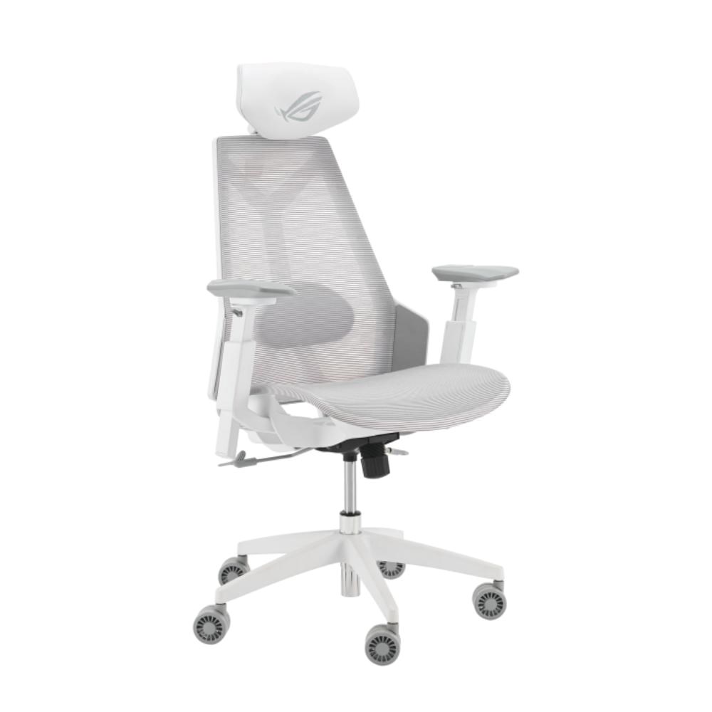 Herní židle ROG Destrier Core ergo s futuristickou estetikou, všestranným nastavením sedadla pro dokonalé držení těla, mobilní herní opěrky rukou a vyrobená z odolného polyamidového nylonu a prodyšné síťoviny pro pohodlné herní maratony.