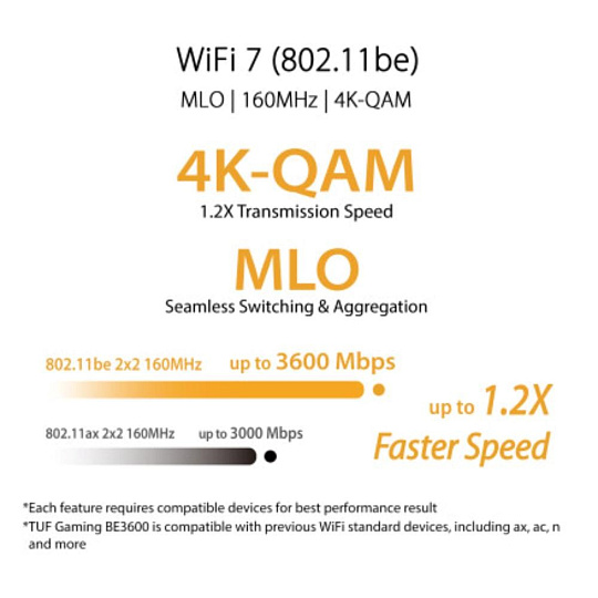 - Modulace 4K-QAM – Zcela nová modulace 4096-QAM nabízí 1,2násobné zvýšení přenosové rychlosti ve srovnání s předchozí generací.
