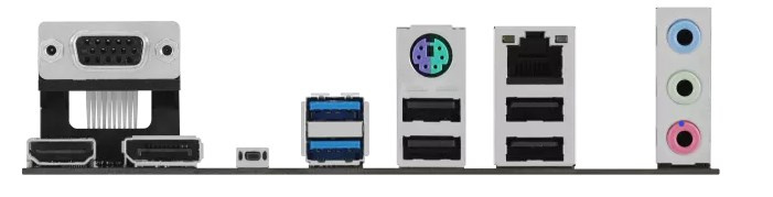 2 x USB 3.2 Gen 1 (5G) ports (2 x Type-A) 4 x USB 2.0 ports (4 x Type-A) 1 x DisplayPort 1 x VGA port 1 x HDMI™ port 1 x Realtek 1Gb Ethernet port 3 x Audio jacks 1 x BIOS FlashBack™ button 1 x PS/2 Keyboard/Mouse combo port