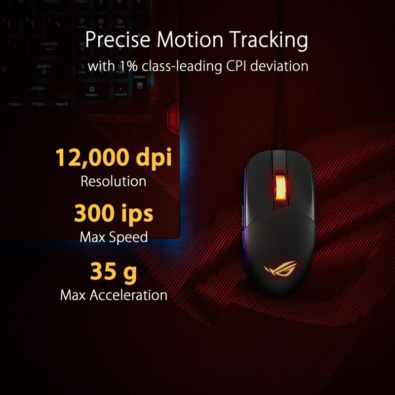 ROG Strix Impact III is a lightweight, ambidextrous form factor, 59-gram wired RGB gaming mouse, suitable for FPS gameplay, featuring a 12,000-dpi optical sensor, near-zero click latency, swappable mouse switch sockets, ROG Micro Mouse Switches, ROG Paracord, 100% PTFE mouse feet, and a durable design.