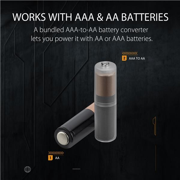 - Funguje s batériami AA alebo AAA prostredníctvom pribaleného držiaka konvertora batérií, ktorý znižuje hmotnosť o 10 %