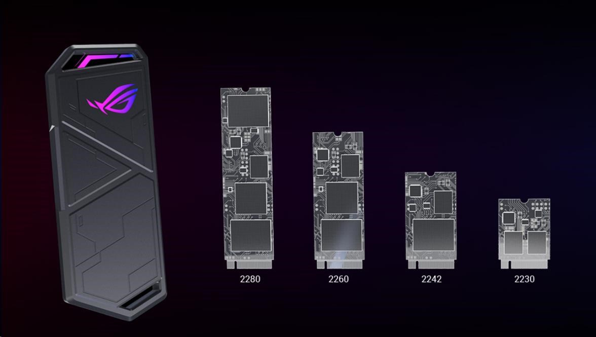 ROG Strix Arion Lite, externé puzdro pre M.2 NVMe SSD úložisko – USB 3.2 Gen 2 Type-C (10 Gb/s), USB-C do USB-C kábel, inštalácia bez použitia skrutkovača, obsahuje tepelnú podložku, vhodný pre PCIe 2280/2260/2242/2230 M key/B+M Key