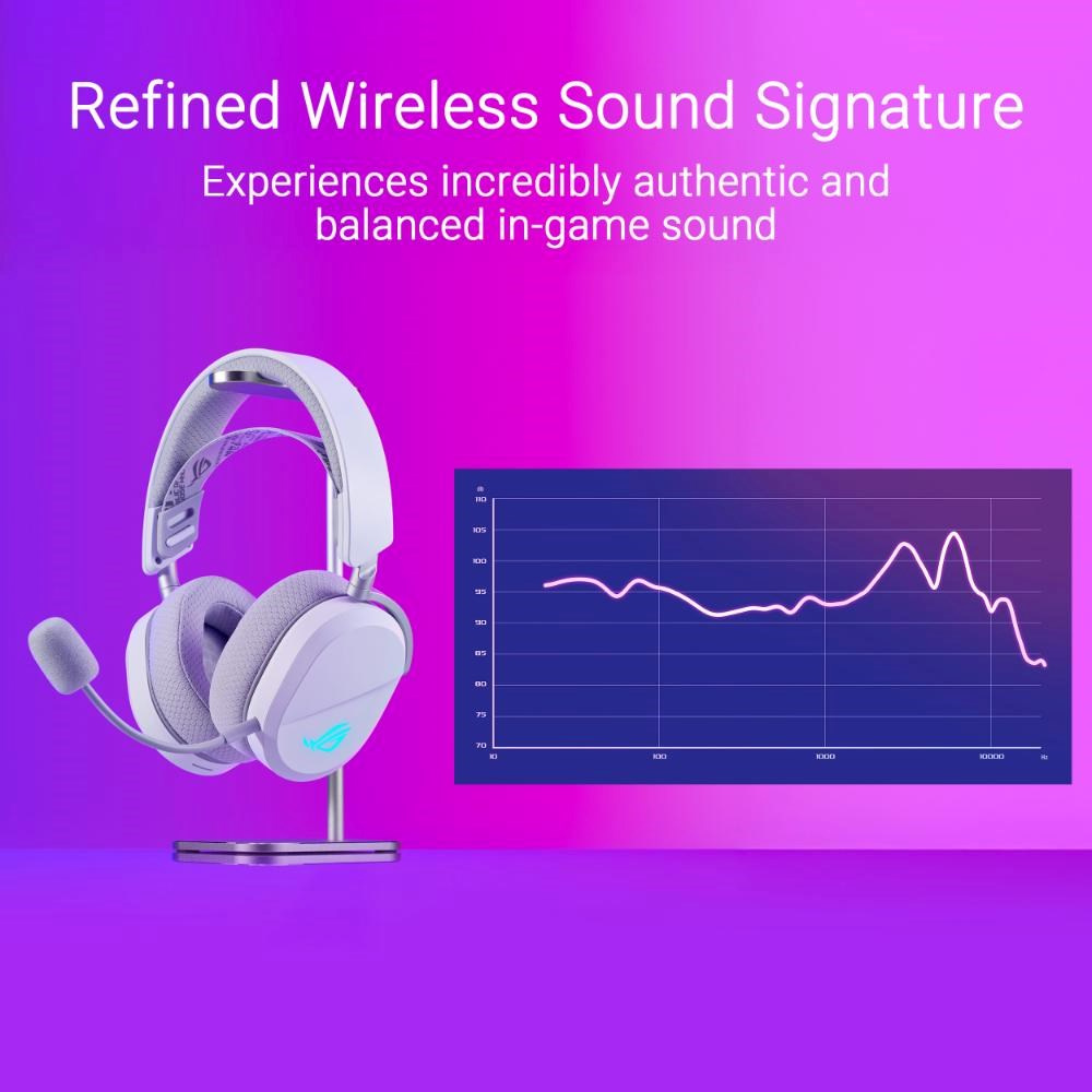 - 50mm meniče ROG s titanovou membránou: Exkluzívne meniče ROG zabezpečujú bohatý, detailný zvuk so širokou frekvenčnou odozvou 20 Hz–20 kHz