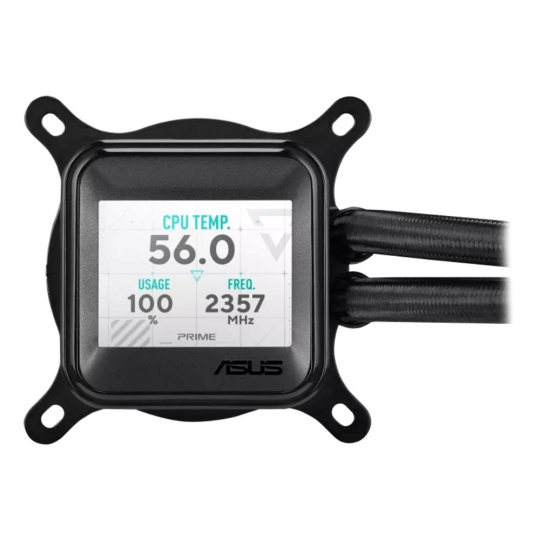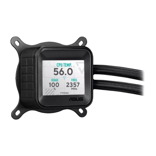 Všetko-v-1 vodný chladič procesora ASUS Prime LC ARGB LCD s ostrým displejom zobrazujúcim informácie o procese a grafickej karte s rôznym pozadím, vysoko výkonným čerpadlom Asetek vybaveným robustným motorom a ventilátormi s možnosťou reťazenia.
