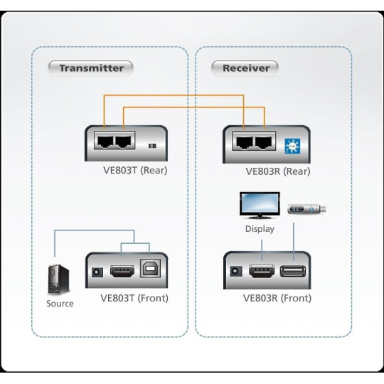 VE803 ATEN HDMI + USB Extender do 60m  Aten VE803 je HDMI a USB Extender, který umožní posílit a přenést signál HDMI a USB mezi zdrojem a zařízením až na 60m ve vynikající kvalitě. Umožní prodloužit např. signál z počítače do monitoru/TV a klávesnice/myši/flashdisku po ethernetovém kabelu. Zařízení se propojuje Cat5E kabelem s RJ45 konektory mezi jednotkami (není součástí, nesmí být zapojen do živé sítě).  Vlastnosti: - vzdálenost kabelů mezi jednotkami až 60m (1080i), 40m (1080p) - podpora vysokých rozlišení: HDTV  480p, 720p, 1080i a 1080p & Podpora počítačových formátů: VGA, SVGA, XGA, SXGA (1280x1024), UXGA(1600x1200) a WUXGA(1920x1200).   - plně kompatibilní s HDMI 1.3b specifikacemi - HDCP kompatibilní - podpora 3D, Deep Color, až 2.25Gbps přenosové pásmo - 8 stupňová ekvalizace kvality a síly signálu - podpora Dolby True HD, DTS HD Master Audio norem zvuku - vestavěná 8KV/15KV ESD ochrana - podpora USB touch panelů - podpora USB2.0 zařízení (až 12Mbps) - podpora širokoúhlých formátů - napájení lokální jednotky z USB portu - Plug and play, jednoduchá instalace - kompaktní design - jednoduše propojí různé typy zdrojů a zařízení: LCD Monitor , Projector , LCD TV.... - multiplatformní podpora: Windows 2000/XP/ Vista/7/8/Linux/Mac a SUN.  - části zařízení se propojují dvěmi Cat5e nebo Cat6 kabely (není součástí),které musí být zapojeny napřímo, nesmí jít přes žádný aktivní prvek, switch apod., doporučujeme ideálně drát, průřez AWG23 - doporučujeme použít kvalitní jeden přímý propojovací UTP kabel, např: kód:sutpd6c1  PremiumCord TP Kabel 4x2,drát UTP Cat6   AWG23,čistá měď 100m  Extender se nesmí zapojit do aktivní počítačové sítě LAN, do switche, routeru nebo do jiného aktivní síťového zařízení. Vysílač a přijímač extenderu musí být přímo propojen LAN kabelem, nejlépe bez přerušení.  Konektory: 1x HDMI vstup samice 1x USB typ B samice  1x HDMI výstup samice 1x USB typ A samice  4x RJ-45 samice na propojení obou částí zařízení  V balení: 1 VE800L (místní jednotka) 1 VE800R (vzdálená jednotka) 1 napájecí adaptér 1 uživatelská příručka.