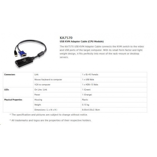 | Konektory | USB samec typu A 1x VGA samec 1x 1x RJ-45 na pripojenie ku KVM |