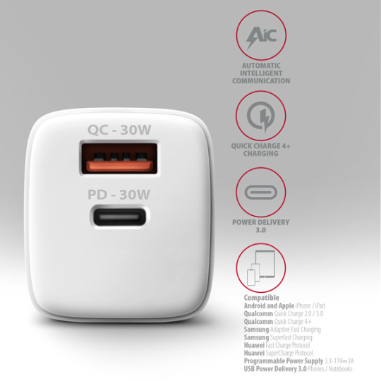 Nabíjačka podporuje 20W PD nabíjanie pre iPhone 12, 13, 14 a 15 a ponúka aj 27W PD nabíjanie pre iPhone 13 Pro, 14 Pro, 15 Pro a ich modely Pro Max. Okrem toho podporuje 25W SFC nabíjanie pre Samsung Galaxy S20 - S24, Séria Note a Z Fold a ponúka aj 30W SFC nabíjanie pre Samsung Galaxy S20 - S24 Ultra, Tab S7+ - S9+, Tab S8 - S9 Ultra. Adaptér je kompatibilný aj s inými štandardmi rýchleho nabíjania telefónov, ako sú Apple iPhone, iPad, Samsung, Huawei, Honor, Xiaomi.