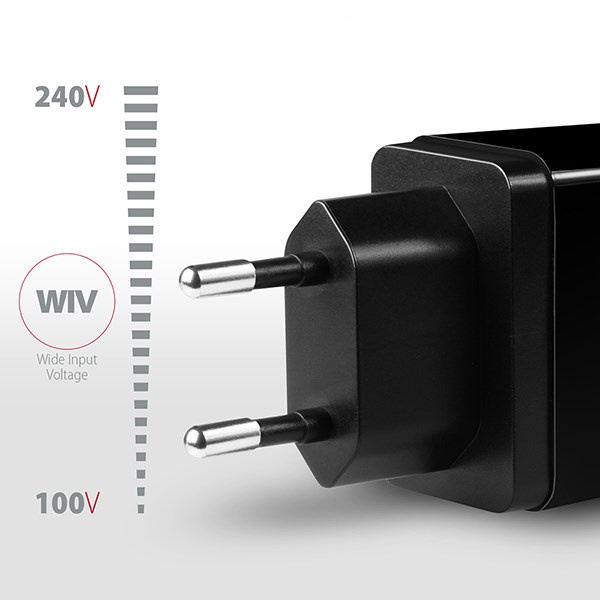 - Wide Input Voltage - funkcia širokého rozsahu vstupného napätia, chráni adaptér pred podpätím a prepätím na vstupe a umožňuje použitie viacerých "národných štandardov napájania".