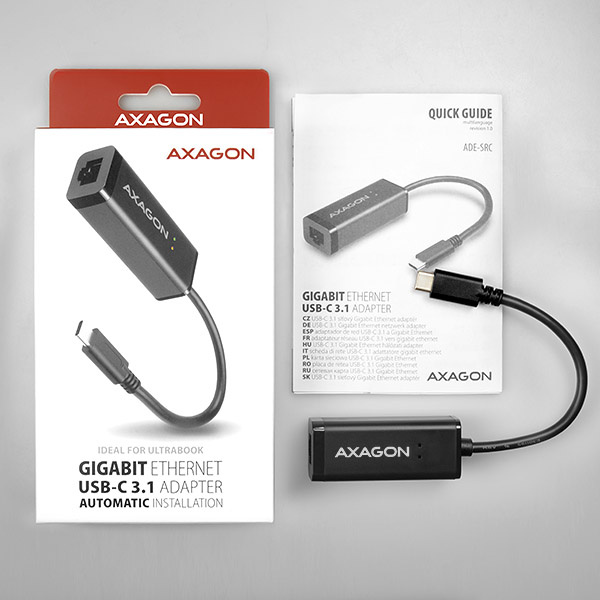 Kompaktný vysokorýchlostný adapter AXAGON ADE-SRC ľahko premení USB-C 3.1 Gen 1 port na Gigabit Ethernet 10/100/1000Mbit port.