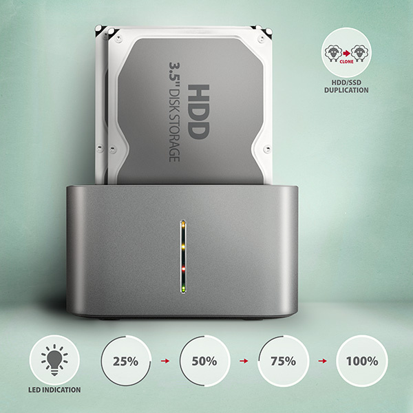 Dokovaciu stanicu môžete použiť aj na jednoduché klonovanie obsahu pripojených diskov bez nutnosti pripojenia k počítaču. Vložte zdrojovú jednotku do prvého slotu HDD A (zdrojový) a cieľovú jednotku do druhého slotu HDD B (cieľový). Potom už len stlačíte tlačidlo klonovania a sledujete proces klonovania na stupnici štyroch LED diód. Po skopírovaní všetkých údajov je na cieľovom disku presná kópia pôvodného disku. Dock je možné použiť ako samostatné zariadenie na pohodlné duplikovanie a vytváranie obrazov diskov. Toto je najjednoduchší spôsob, ako preniesť obsah starého HDD na nový SSD vrátane funkčného operačného systému (Windows, macOS, Linux...).