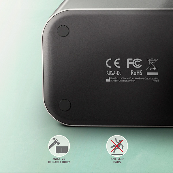 Puzdro stanice je robustné a odolné, čo umožňuje dokonalú stabilitu aj pri vložených diskoch. Gumené nožičky znižujú kĺzanie po stole a vibrácie pevných diskov. Vonkajší plášť je vyrobený z hliníka s elegantným brúseným povrchom.