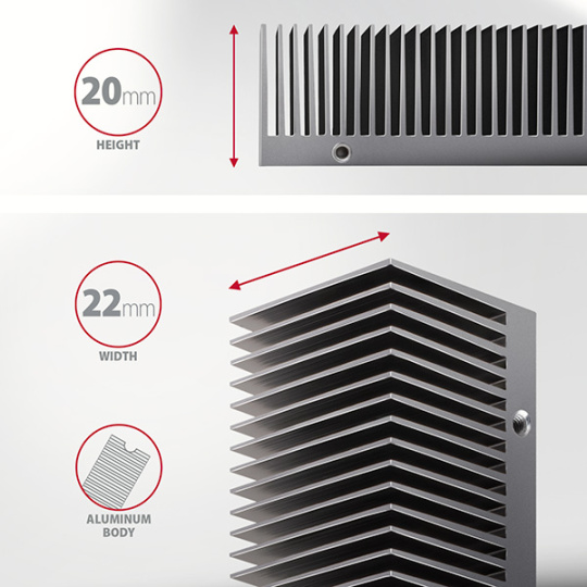 Vďaka svojej celkovej výške 24 mm a chladiču s výškou 20 mm je možné chladič umiestniť aj do skrinky s obmedzeným priestorom. Priečne rebrá hliníkového chladiča a kovový rám optimalizujú odvod tepla z M.2 SSD, čo dokáže znížiť teplotu disku až o 30 °C. To predlžuje životnosť SSD a zabraňuje spomaleniu rýchlosti disku, takzvanému "tepelnému škrteniu".