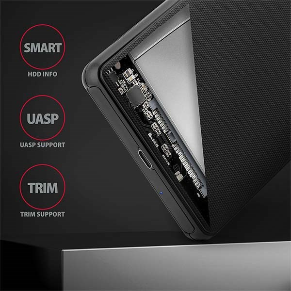 RozhranieSATA 6G s podporou UASP vám umožní využívať rýchlosť moderných diskov SSD. Podpora funkcie TRIM na obmedzenie postupného znižovania výkonu SSD v priebehu času. Čítanie S.M.A.R.T. informácie, ktoré monitorujú stav externého disku. Podporuje uspávanie pripojeného disku a boxu.