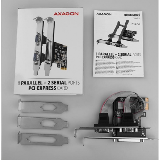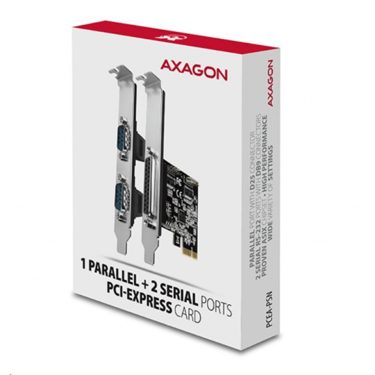 Karta AXAGON PCEA-PSN PCI-Express rozširuje váš stolný počítač o jeden paralelný port s konektorom DB25 na doske a dva sériové porty RS-232 s konektormi DB-9 na záslepke.