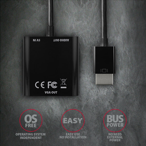HDMI -> VGA aktívny adaptér AXAGON RVH-VGAN s audio výstupom pre pripojenie staršieho VGA monitora/TV/projektora k počítaču alebo inému zariadeniu s výstupom HDMI. Redukciu je možné použiť aj so set-top boxy alebo hernými konzolami Xbox a PlayStation.