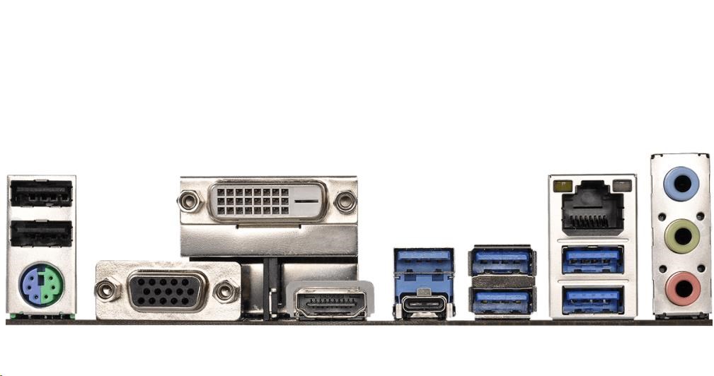 | Rear panel I/O | 1 x PS/2 Mouse/Keyboard Port 1 x D-Sub Port 1 x DVI-D Port 1 x HDMI Port 2 x USB 2.0 Ports (Supports ESD Protection) 1 x USB 3.1 Gen1 Type-C Port (Supports ESD Protection) 5 x USB 3.1 Gen1 Ports (Supports ESD Protection) 1 x RJ-45 LAN Port with LED (ACT/LINK LED and SPEED LED) HD Audio Jacks: Line in / Front Speaker / Microphone |