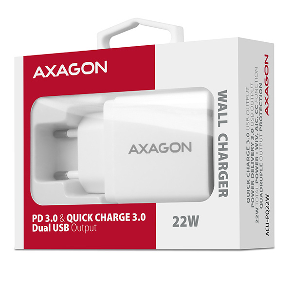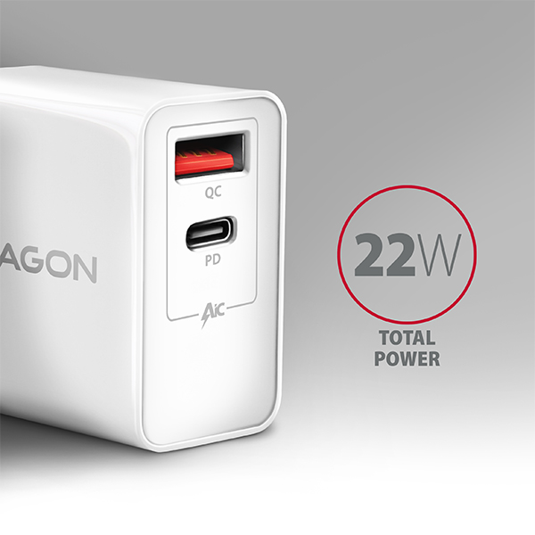 BAZAR - AXAGON ACU-PQ22W, PD & QC nabíječka do sítě 22W, 2x port (USB-A + USB-C), PD3.0/QC3.0/AFC/FCP/Apple, bílá