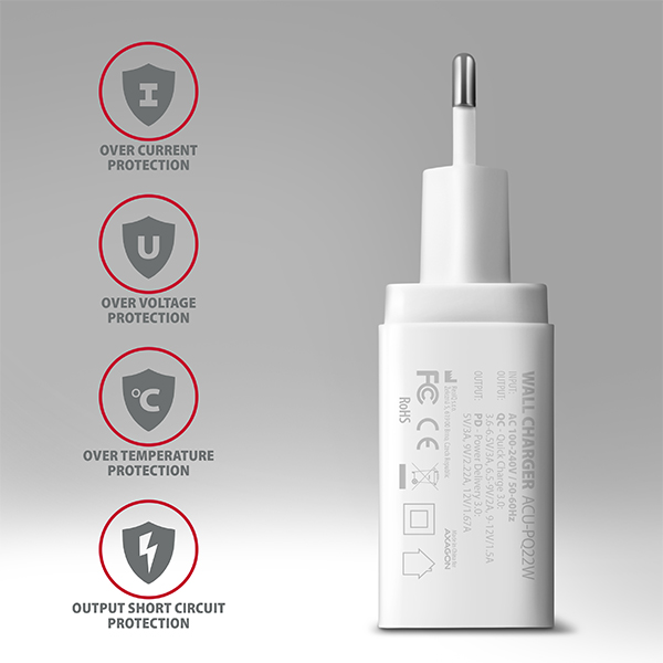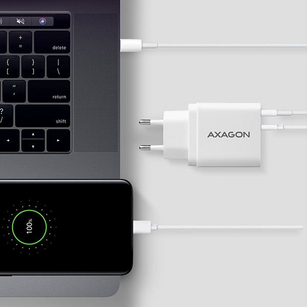 Univerzálna sieťová nabíjačka AXAGON ACU-PQ22W USB na rýchle nabíjanie až dvoch mobilných zariadení súčasne.