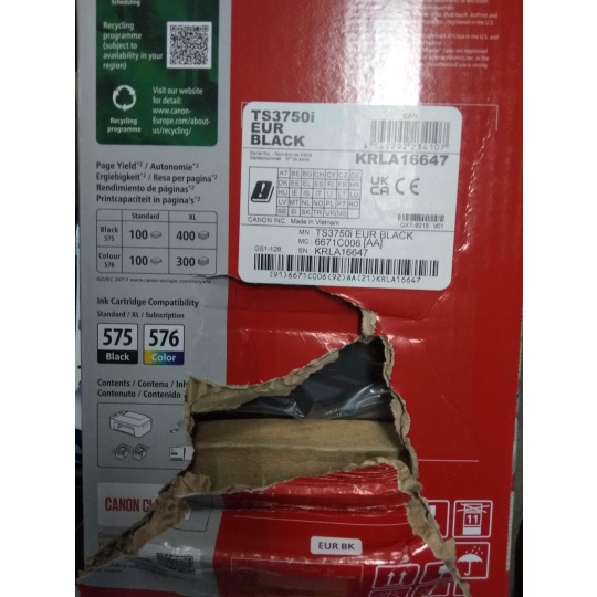 BAZAR -Canon PIXMA Tiskárna TS3750i black - barevná, MF (tisk, kopírka, sken, cloud), USB, Wi-Fi ( poškodený obal )