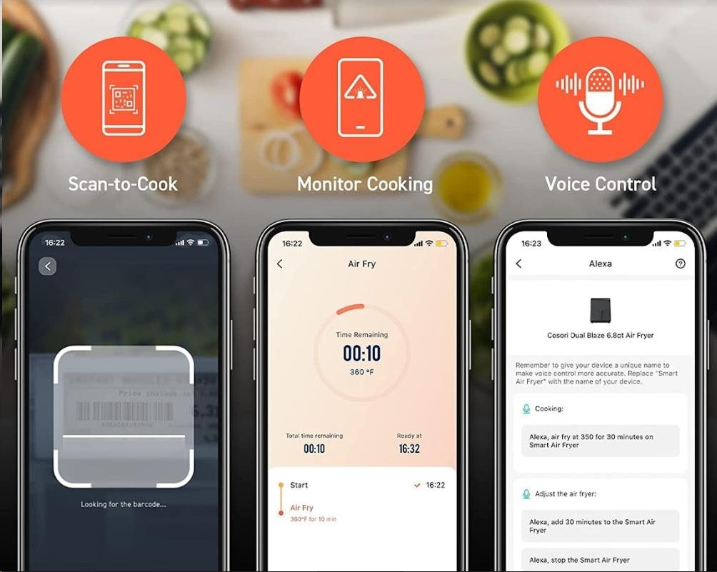S horkovzdušnou fritovacou hlavu COSORI CAF-P583S SMART si môžete vychutnať vaše obľúbené vyprážané jedlá bez výčitiek, pretože na rozdiel od bežného vyprážania alebo fritovania je v tejto horkovzdušnej fritovacej hlave možné pripravovať jedlá s použitím veľmi malého množstva oleja alebo vôbec žiadneho. Patentovaná technológia THERMO IQ 360° HEAT CIRCULATION presne riadi teplotu inteligentným teplotným algoritmom a zabezpečuje rovnomerne uvarené jedlo bez nutnosti jeho pretrepávania alebo preklápania. Kombinácia cirkulujúceho horúceho vzduchu, dokonalé teploty varenia a chytrých programov zabezpečí, že hranolky budú vždy krásne chrumkavé a kuracie stehná šťavnaté. Programy si môžete rýchlo a pohodlne nastaviť aj cez smartphone alebo Amazon Alexa a Google Assistant. Keď budete mať hotovo, čistenie bude rovnako jednoduché vďaka neprilnavému košu, ktorý je možné umývať v umývačke riadu. Vďaka veľkej nádobe s objemom 6,4l navyše dokážete rýchlo uvariť aj pre väčšiu rodinu alebo skupinu hostí.