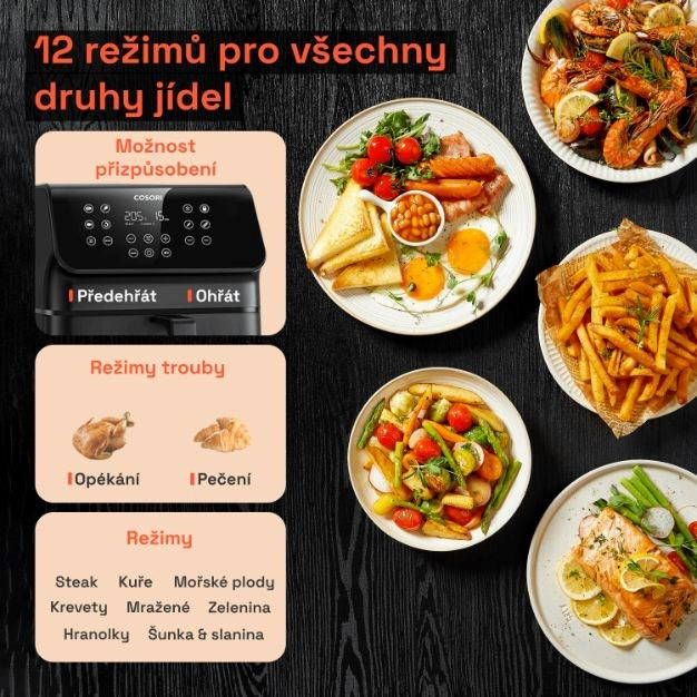 Predstavujeme teplovzdušnú fritézu Cosori Premium II vo verzii Plus. Inovatívne riešenie, ktoré šetrí nielen čas, ale aj energiu a ponúka spôsob varenia, ktorý je šetrný k zdraviu. S teplovzdušnou fritézou si môžete vychutnať svoje obľúbené jedlá pripravené s minimom oleja, vyhnete sa zápachu z vyprážania a čistenie je vďaka košu, ktorý možno umývať v umývačke riadu, hračkou. Fritéza ponúka kôš s veľkorysým objemom 6,2 litra, takže v nej pohodlne pripravíte jedlo pre 3 až 5 osôb, napríklad celé kurča s hmotnosťou 2,3 kg. Verzie Plus je vybavená okienkom a svetlom, takže vidíte, v akej fáze prípravy sa práve nachádzate, bez toho aby ste museli vysúvať kôš a prerušovať prípravu. Pri veľkom objeme si fritéza zachováva malé vonkajšie rozmery, takže je vhodná aj do malých kuchýň. Vďaka technológii 360° cirkulácie vzduchu sa fritéza zohreje na prevádzkovú teplotu za menej ako 5 minút, čo ďalej výrazne skracuje čas prípravy. Malý objem znamená aj nízku spotrebu energie v porovnaní s bežnou rúrou. Fritéza ponúka 12 programov na prípravu pokrmov, ktoré možno nastaviť podľa individuálnych chutí. Displej fritézy je prehľadný a pohodlne naklonený pre dokonalú čitateľnosť. V dnešnej digitálnej dobe je atraktívna aj funkcia stlmenia tlačidiel. Ako bonus k dodávanej viacjazyčnej kuchárskej knihe si môžete stiahnuť elektronickú kuchársku knihu s 80 receptami v českom aj slovenskom jazyku. V balení nájdete aj 5 ihiel na špíz a mriežku na špíz.