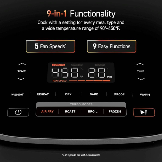 Cosori TurboBlaze ponúka rôzne možnosti predprogramovanej prípravy jedál, ako fritovanie, pečenie, grilovanie, dusenie, sušenie ovocia alebo zeleniny, rozmrazovanie, prihrievanie či udržovanie teploty a tieto nastavenia je možné ďalej upraviť podľa vašich preferencií