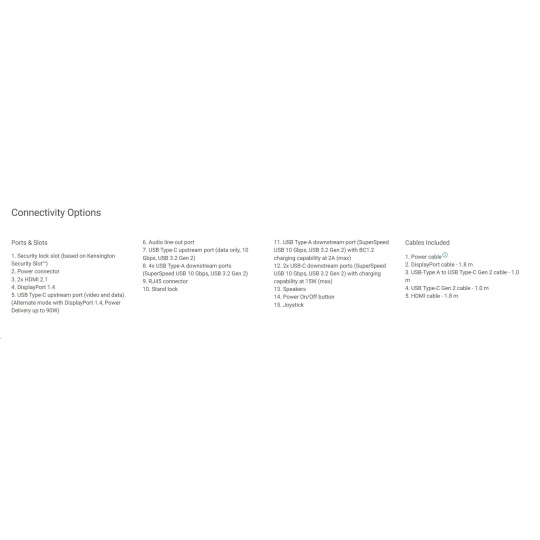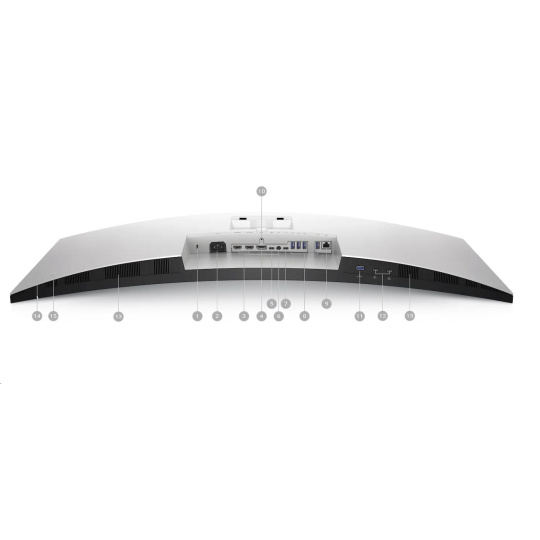 | 1. Bezpečnostná zásuvka (na základe Kensington Security Slot™) 2. Napájací konektor 3. 2x HDMI 2.1 4. DisplayPort 1.4 5. USB Type-C upstream port (video a dáta). (Alternatívny režim s DisplayPort 1.4, Podpora napájania až do 90W) 6. Výstup na audio line-out 7. USB Type-C upstream port (len dáta, 10 Gbps, USB 3.2 Gen 2) 8. 4x USB Type-A downstream ports (SuperSpeed USB 10 Gbps, USB 3.2 Gen 2) 9. RJ45 konektor 10. Zámok stojana 11. USB Type-A downstream port (SuperSpeed USB 10 Gbps, USB 3.2 Gen 2) s podaním nabíjania BC1.2 2A (max) 12. 2x USB-C downstream porty (SuperSpeed USB 10 Gbps, USB 3.2 Gen 2) s nabíjaním do 15W (max) 13. Reproduktory 14. Tlačidlo zapnutia/vypnutia 15. Joystick |