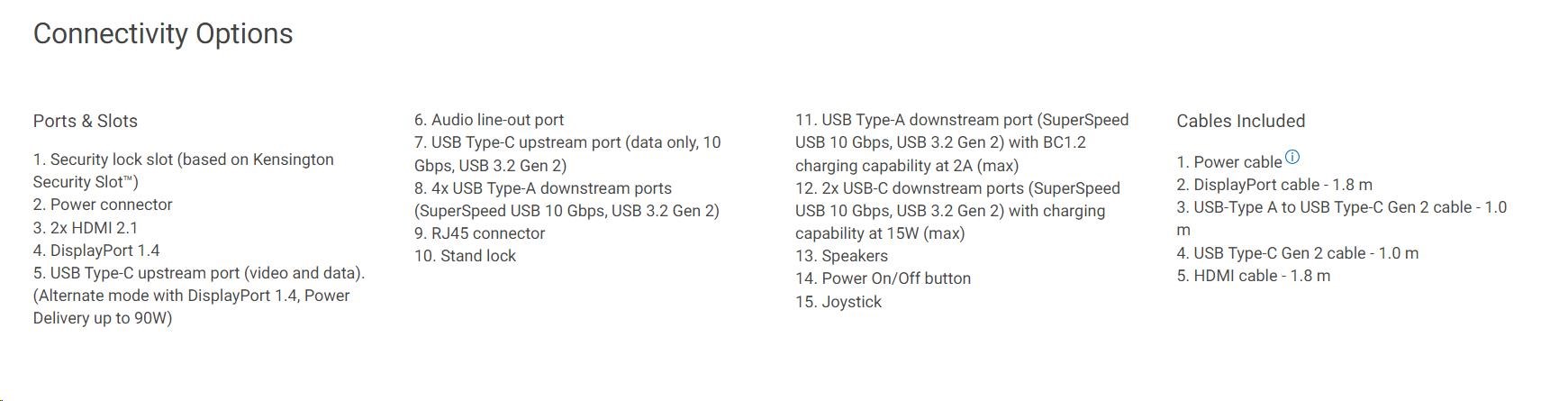 | 1. Bezpečnostná zásuvka (na základe Kensington Security Slot™) 2. Napájací konektor 3. 2x HDMI 2.1 4. DisplayPort 1.4 5. USB Type-C upstream port (video a dáta). (Alternatívny režim s DisplayPort 1.4, Podpora napájania až do 90W) 6. Výstup na audio line-out 7. USB Type-C upstream port (len dáta, 10 Gbps, USB 3.2 Gen 2) 8. 4x USB Type-A downstream ports (SuperSpeed USB 10 Gbps, USB 3.2 Gen 2) 9. RJ45 konektor 10. Zámok stojana 11. USB Type-A downstream port (SuperSpeed USB 10 Gbps, USB 3.2 Gen 2) s podaním nabíjania BC1.2 2A (max) 12. 2x USB-C downstream porty (SuperSpeed USB 10 Gbps, USB 3.2 Gen 2) s nabíjaním do 15W (max) 13. Reproduktory 14. Tlačidlo zapnutia/vypnutia 15. Joystick |