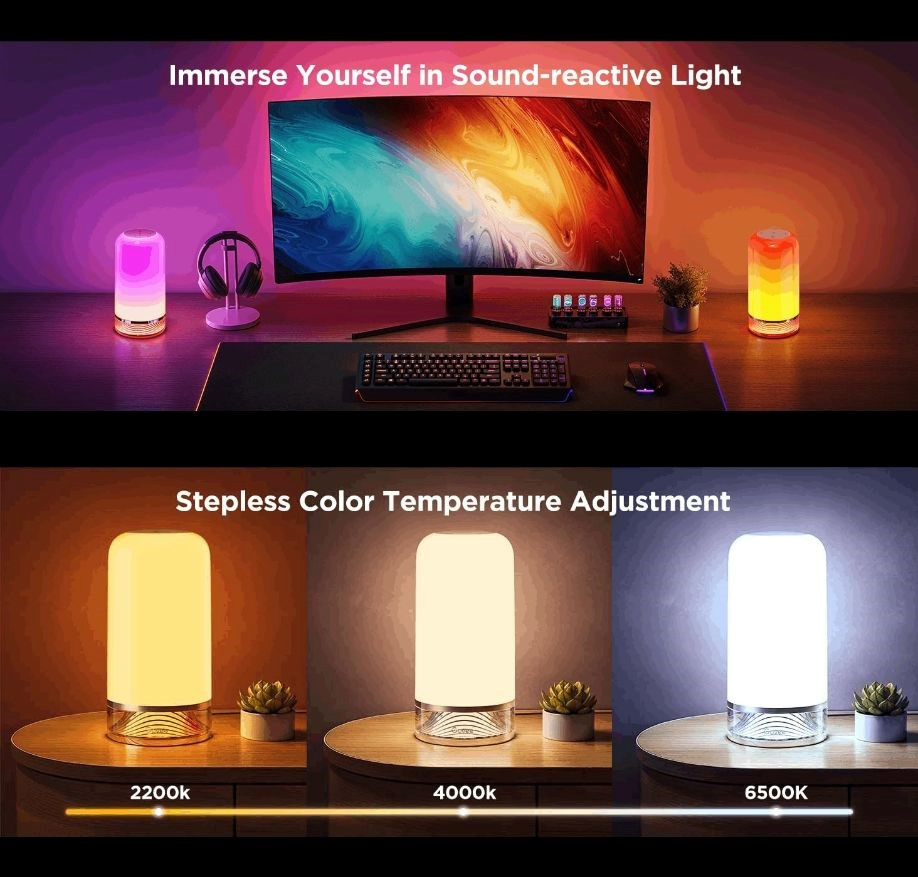 Govee LED Table Lamp 2 je vybavená funkciou vizualizácie hudby prostredníctvom integrovaného mikrofónu, ktorý synchronizuje svetelné efekty s rytmom hudby. Vďaka tejto technológii lampa reaguje na každý tón a basovú linku a vytvára dynamické osvetlenie, ktoré zodpovedá nálade hudby, či už ide o jemné melódie alebo energické rytmy. Ponúka rôzne svetelné efekty, ktoré sa prispôsobujú rôznym hudobným žánrom, od jemných farebných vĺn až po pulzujúce viacfarebné záblesky, vďaka čomu je lampa dokonalým doplnkom na domáce párty, relaxačné chvíle alebo do kreatívneho prostredia.