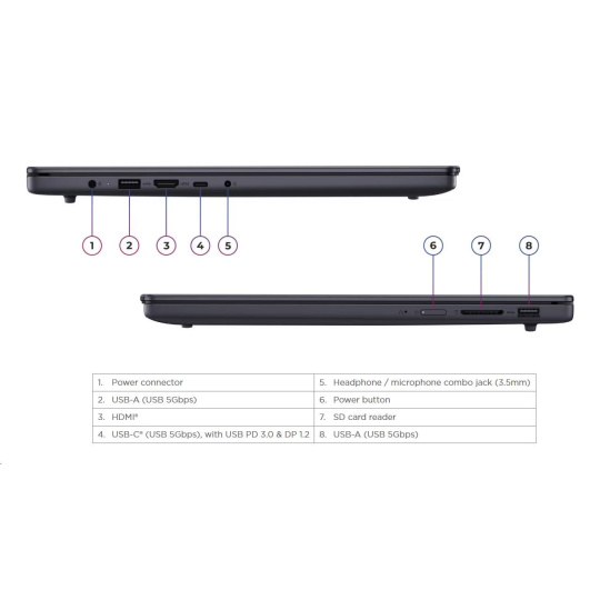 | Standartné porty | 2x USB-A (USB 5Gbps / USB 3.2 Gen 1) 1x USB-C® (USB 5Gbps / USB 3.2 Gen 1), with USB PD 3.0 and DisplayPort™ 1.2 1x HDMI® 1.4 1x Headphone / microphone combo jack (3.5mm) 1x SD card reader 1x Power connector |