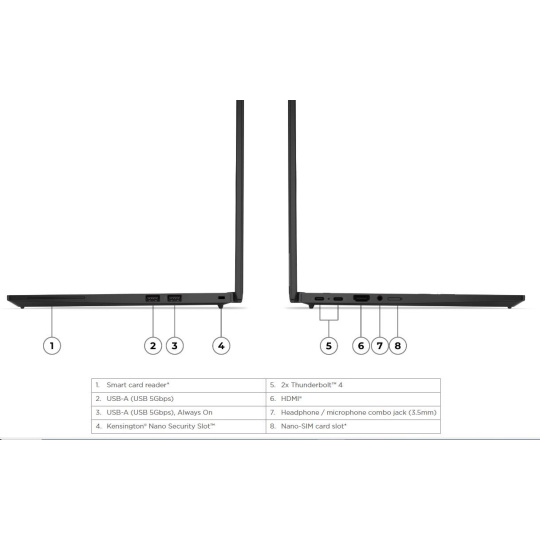 | Standartné porty | 1x USB-A (USB 5Gbps / USB 3.2 Gen 1) 1x USB-A (USB 5Gbps / USB 3.2 Gen 1), Always On 2x USB-C® (Thunderbolt™ 4 / USB4® 40Gbps), with USB PD 3.0 and DisplayPort™ 2.1 1x HDMI® 2.1, up to 4K/60Hz 1x Headphone / microphone combo jack (3.5mm)  |