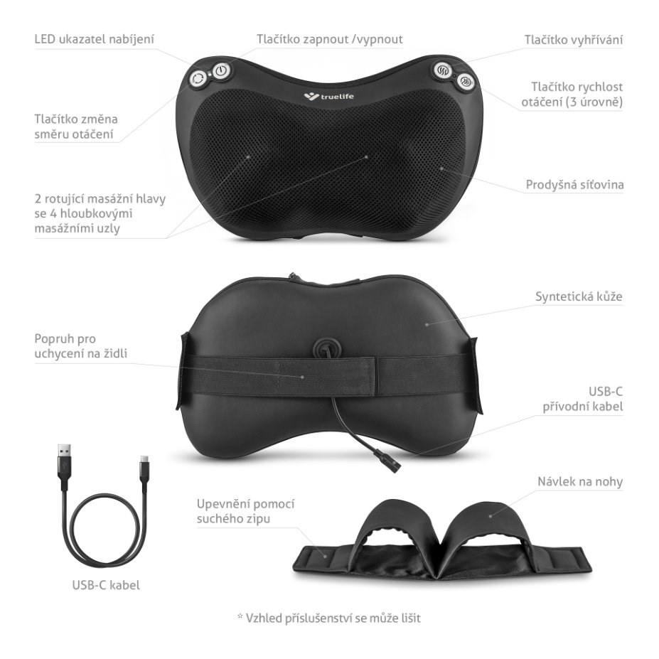 TrueLife RelaxBack B3 Charge - masážní polštář s dobíjecí baterií - Poškozený obal (Komplet)